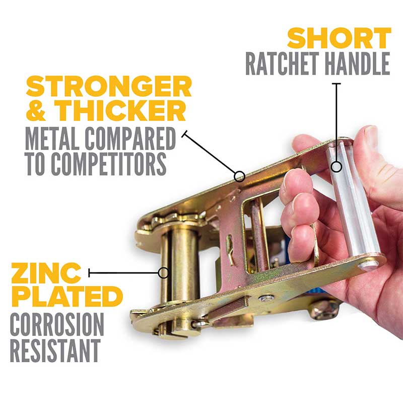 బలం మరియు మన్నిక కోసం ప్రీమియం పాలిస్టర్ వెబ్బింగ్ మా టై-డౌన్ పట్టీల యొక్క పాలిస్టర్ వెబ్బింగ్ అసాధారణమైన బలాన్ని కనిష్టంగా సాగదీస్తుంది, UV- మరియు నీటి-నిరోధకతతో కలిపి కఠినమైన పర్యావరణ పరిస్థితులను తట్టుకుంటుంది. కామ్ పట్టీల వలె కాకుండా, మా రాట్చెట్ పట్టీలు కేవలం ఆపరేటర్ బలంపై ఆధారపడవు, సురక్షితమైన ఫిట్కి అవసరమైన టెన్షన్ని ఖచ్చితంగా వర్తింపజేయడానికి మిమ్మల్ని అనుమతిస్తుంది. మా వెబ్బింగ్లో ఉపయోగించే నూలు చాలా మంది పోటీదారుల కంటే మందంగా ఉంటుంది, అంగుళానికి ఎక్కువ పిక్ కౌంట్ ఉంటుంది, రాపిడికి, చిరిగిపోవడానికి మరియు కత్తిరించడానికి మెరుగైన నిరోధకతను అందిస్తుంది. అదనంగా, అదనపు మన్నిక కోసం చివరలు వేడి-సీలు చేయబడతాయి.