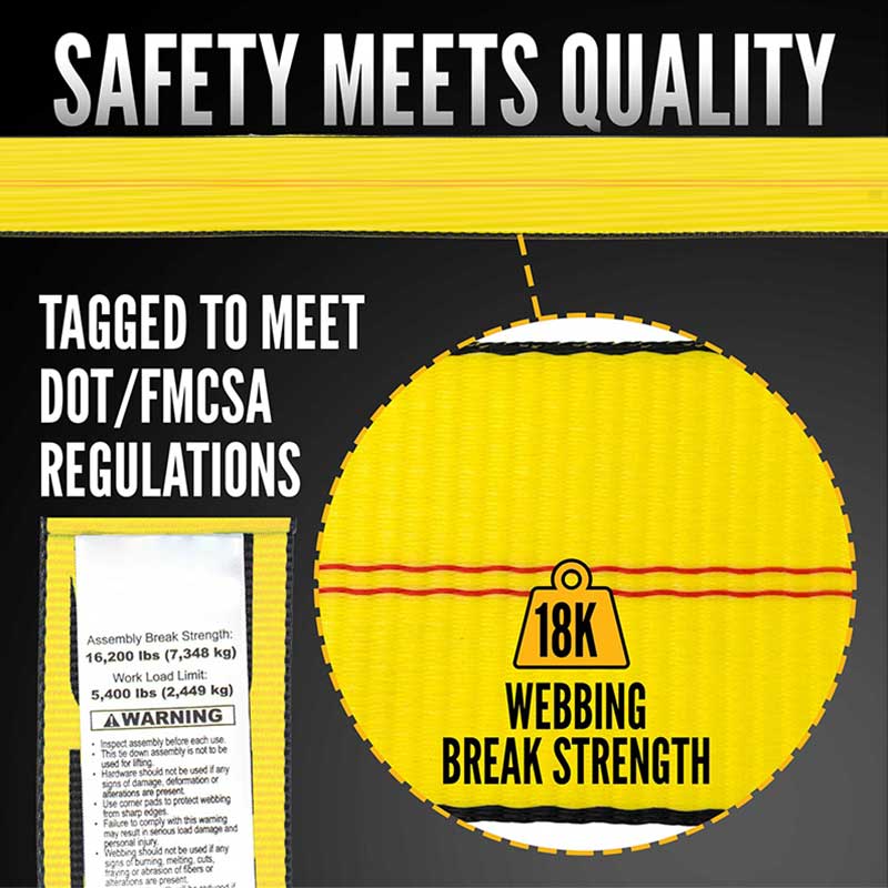 పరిశ్రమ వర్తింపు మరియు భద్రతా ప్రమాణాలు FMCSA మరియు DOT నిబంధనలు, CVSA మరియు WSTDA మార్గదర్శకాలు మరియు నార్త్ అమెరికన్ కార్గో సెక్యూర్మెంట్ స్టాండర్డ్స్కు అనుగుణంగా ఉండేలా, ఫ్లాట్ హుక్స్తో కూడిన ఫోర్స్ 3 X 30' ఎల్లో రాట్చెట్ స్ట్రాప్తో సహా మా అన్ని రాట్చెట్ స్ట్రాప్లు బ్రేక్ స్ట్రెంగ్త్ మరియు వర్కింగ్ లోడ్ లిమిట్తో ట్యాగ్ చేయబడ్డాయి మరియు స్టెన్సిల్ చేయబడ్డాయి. సరైన లోడ్ హ్యాండ్లింగ్ మరియు సురక్షిత మార్గదర్శకాల కోసం WSTDA భద్రతా బులెటిన్లను సమీక్షించాలని మేము సిఫార్సు చేస్తున్నాము.